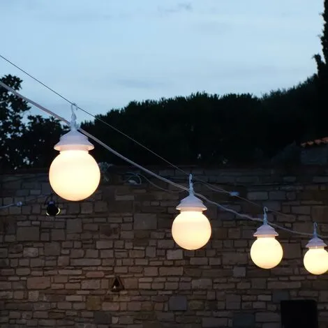 GUIRLANDE LUMINEUSE E27 : Cherry W10 est une guirlande lumineuse blanche à ampoules culot E27 qui disposent de crochets pour pouvoir les suspendre à votre gré. Cette guirlande lumineuse LED se distingue par son design tendance et épuré. Elle est idéale pour faire briller vos fêtes ou vos soirées romantiques. Vous allez adorer son côté design et élégant pour illuminer vos plus beaux événements.UTILISATION EXTÉRIEUR / INTÉRIEUR : après avoir branché votre guirlande lumineuse sur secteur (prise de courant 220 V), vous pourrez utiliser cette guirlande design de partout, aussi bien à l’extérieur qu’à l’intérieur. La guirlande Cherry W10 apportera à votre lieu une décoration chic et tendance. PRATIQUE : cette guirlande lumineuse blanche peut s’utiliser aussi bien à l’intérieur qu’à l’extérieur. Elle apportera, à votre terrasse ou votre jardin, une atmosphère festive. Dans une chambre ou dans un salon, elle amènera de l’élégance. Cherry W10 s’adapte à toutes les situations.INTENSITÉ : la guirlande Cherry W10 possède 10 ampoules (changeables) LED blanc qui apporteront à votre espace une ambiance élégante. Cette guirlande lumineuse apporte un bel éclairage d’ambiance avec son flux lumineux de moins de 100 Lumens.ROBUSTE : la guirlande originale Cherry W10, protégée contre les éclaboussures (IP44) et résistante aussi aux UV, fait une longueur totale de 10m. Cette guirlande lumineuse est composée de 10 ampoules rondes et blanches LED blanc qui permettront de tamiser l’ambiance. Il y a 75cm entre chaque ampoule.