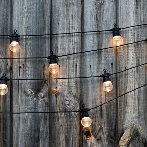 GUIRLANDE LUMINEUSE LED : Party Clear 20 est une guirlande lumineuse LED blanc chaud avec plusieurs modes. Cette guirlande se distingue par son design simple et tendance. Les ampoules sont fixées sur la guirlande mais des petits crochets au-dessus permettent de les suspendre. Elle est idéale comme guirlande design, guirlande décorative intérieur et extérieur ou encore pour illuminer vos soirées ou fêtes. Rien de mieux que cette guirlande lumineuse pour accompagner vos meilleures soirées d’été.UTILISATION EXTÉRIEUR / INTÉRIEUR : après avoir branché votre guirlande sur secteur (transformateur prise), vous pourrez utiliser cette guirlande design de partout, aussi bien à l’extérieur qu’à l’intérieur. La guirlande Party Clear 20 apportera à votre pièce une décoration tendance et originale.PRATIQUE : cette guirlande tendance peut s’utiliser comme guirlande d’extérieur pour la terrasse, comme guirlande pour le salon ou bien comme guirlande de décoration intérieur/extérieur. Party Clear 20 s’adapte à toutes les situations.INTENSITÉ : la guirlande lumineuse Party Clear 20 possède une luminosité blanc chaud qui apporte à votre espace une ambiance festive et chaleureuse. Elle peut être réglée en 8 modes différents (variation du rythme d’éclairage), vous permettant d’adapter le degré de luminosité indépendamment sur toutes vos guirlandes Party Clear 20. Elle fonctionne sur une base LED intégrée. Cette guirlande lumineuse est un bel éclairage d’ambiance avec un flux lumineux de moins de 100 Lumens.ROBUSTE : ainsi, la guirlande lumineuse LED Party Clear 20 design d’une longueur totale de 8.70m composée de 20 ampoules rondes transparentes est protégée contre les éclaboussures (IP44) et résiste aussi aux UV. Il y a 30cm entre chaque ampoule et 3m de la prise à la première ampoule.