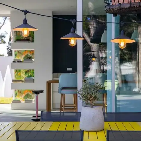 GUIRLANDE SOLAIRE LUMINEUSE E27 : VINTY LIGHT SOLAR est une guirlande solaire lumineuse à ampoules E27 à filament qui disposent de passants pour pouvoir la suspendre à votre gré. Cette guirlande lumineuse LED avec abat-jour en acier se distingue par son design à la fois rétro et tendance. Elle est idéale pour faire briller vos soirées et vous allez adorer son côté design et vintage pour illuminer vos plus beaux événements.UTILISATION EXTÉRIEUR / INTÉRIEUR : après avoir fixé votre guirlande et installé son panneau solaire dans un emplacement bien exposé, VINTY LIGHT SOLAR apportera à votre espace une décoration chic et tendance. PRATIQUE : cette guirlande solaire lumineuse LED peut s’utiliser aussi bien à l’intérieur qu’à l’extérieur. Elle apportera, à votre terrasse ou votre jardin, une atmosphère festive dans un esprit guinguette chic. Dans une chambre ou dans un salon, elle amènera sa touche vintage. VINTY LIGHT SOLAR s’adapte à toutes les situations.INTENSITÉ : la guirlande VINTY LIGHT SOLAR possède 10 ampoules à filament (changeables) LED blanc chaud qui apporteront à votre espace une ambiance élégante. Cette guirlande guinguette éclaire très bien avec son flux lumineux de plus de 400 Lumens.ROBUSTE : la guirlande originale VINTY LIGHT SOLAR, protégée contre les éclaboussures (IP44) et résistante aussi aux UV, fait une longueur totale de 6m. L’abat-jour fait 19cm de diamètre. Cette guirlande lumineuse est composée de 10 ampoules à filament LED blanc chaud, longues et transparentes qui permettront de créer une ambiance chaleureuse. Il y a 40cm entre chaque ampoule et 2m du panneau solaire à la première ampoule.