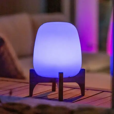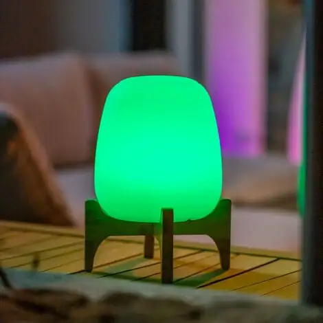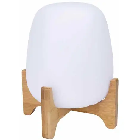 LAMPE DE TABLE LED : PALMY est une lampe de table sans fil LED blanc chaud / blanc froid / multicolore avec intensité variable. Cette lampe à poser se distingue par son design moderne, atypique et épuré mais également par son autonomie de fonctionnement (jusqu’à 8h). Avec son support en bambou naturel, elle apportera à votre décoration une touche tendance, originale et chaleureuse.UTILISATION EXTÉRIEUR / INTÉRIEUR : après une charge rapide de votre lampe Palmy, vous pourrez utiliser cette jolie lampe partout, à l’extérieur comme dans la maison. Que ce soit comme lampe d’extérieur pour la terrasse, comme lampe de table pour le salon, comme lampe de bureau ou comme lampe de chevet dans la chambre d’enfant, la lampe Palmy s’adapte à toutes les situations.AUTONOMIE : la lampe Palmy, une fois chargée à son maximum, peut éclairer tout autour de vous pendant près de 8 heures. Le temps de chargement complet de la lampe est de 4-5 heures avec son câble de chargement USB fourni. VARIATEUR INTENSITÉ : la lampe Palmy possède une luminosité à intensité variable vous permettant ainsi d’adapter le degré de luminosité indépendamment. Cette lampe est un bel éclairage d’ambiance avec son flux lumineux de moins de 100 Lumens.PRATIQUE, ROBUSTE & FUN : ainsi, la lampe LED design d’une hauteur de 26cm et large de 20,4cm, est protégée contre les éclaboussures (IP44) et résiste aussi aux UV. La lampe PALMY se nettoie facilement avec de l’eau tiède et du savon doux.